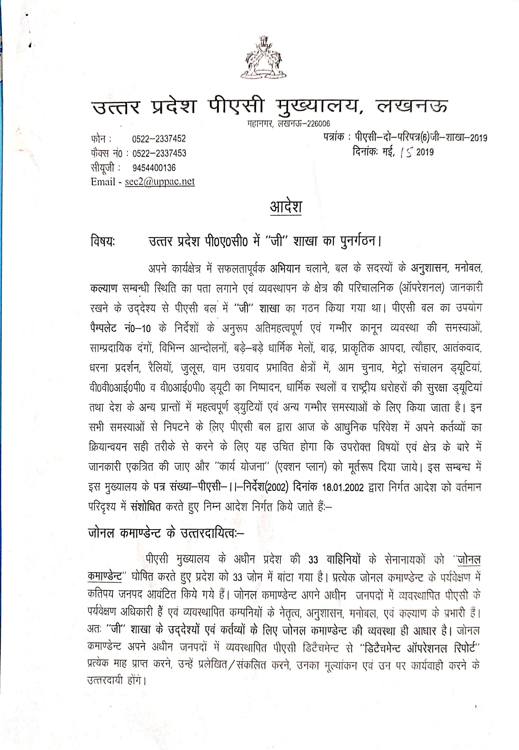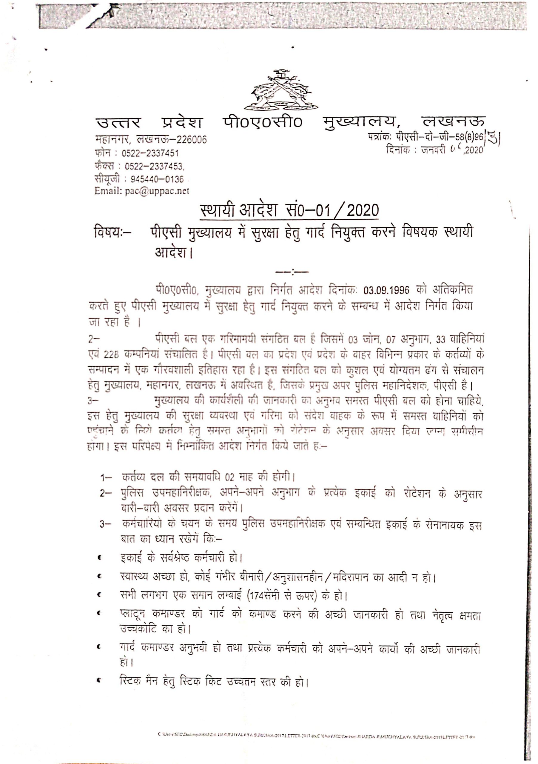 स्थायी आदेश 01/2020 पीएसी मुख्यालय में सुरक्षा हेतु गार्द नियुक्ति करने विषयक स्थायी आदेश जनवरी ०६ ,2020