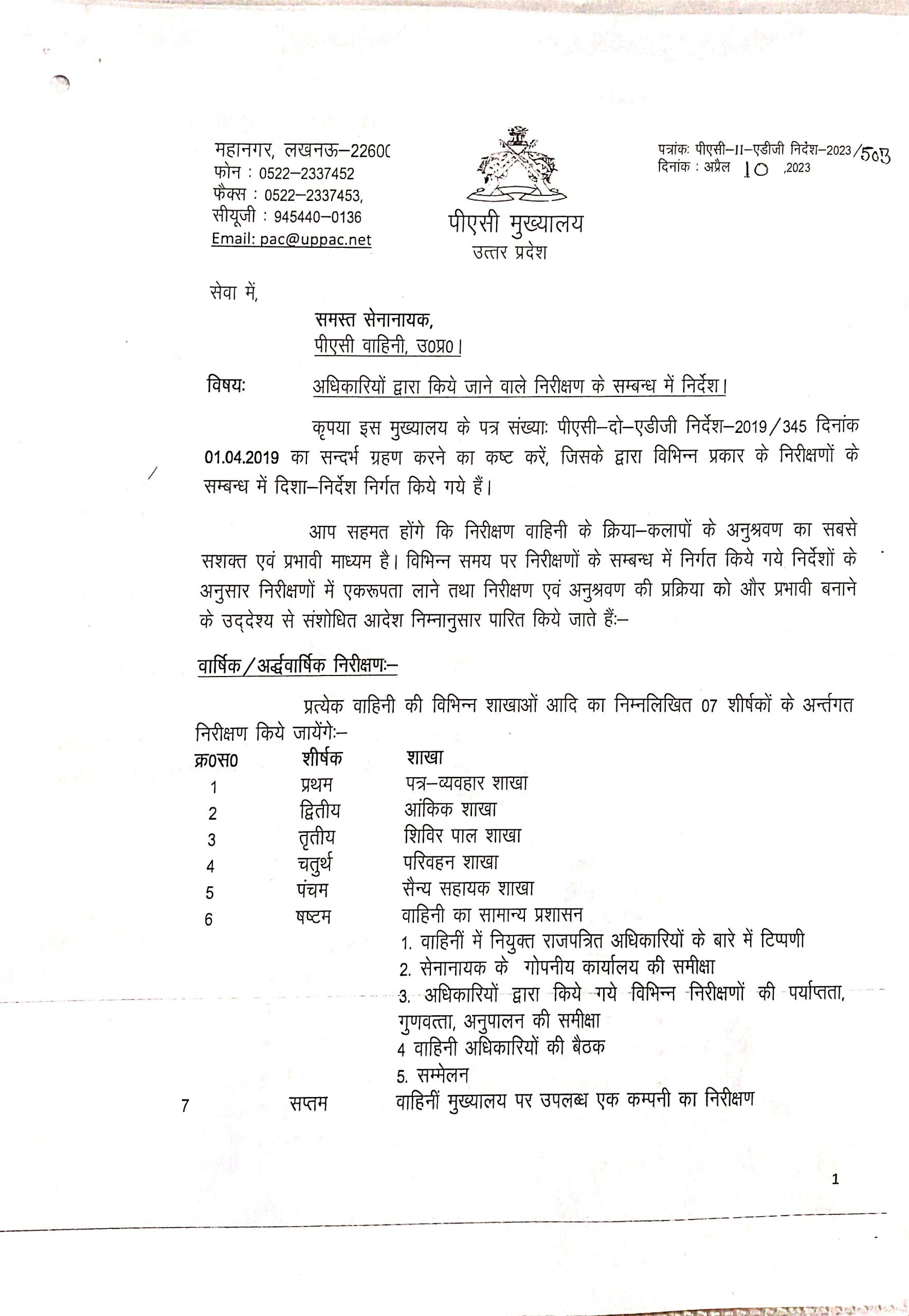 अधिकारीयों द्वारा किये जाने वाले निरीक्षण के सम्बन्ध में निर्देश 10,अप्रैल, 2023